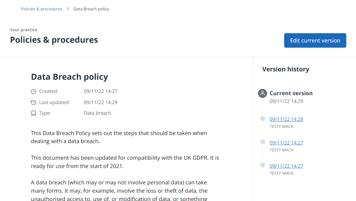 You can view the current policy or procedure document and make changes to it. When you view a document, you can view previous versions of it, but you can only make changes to the current version.