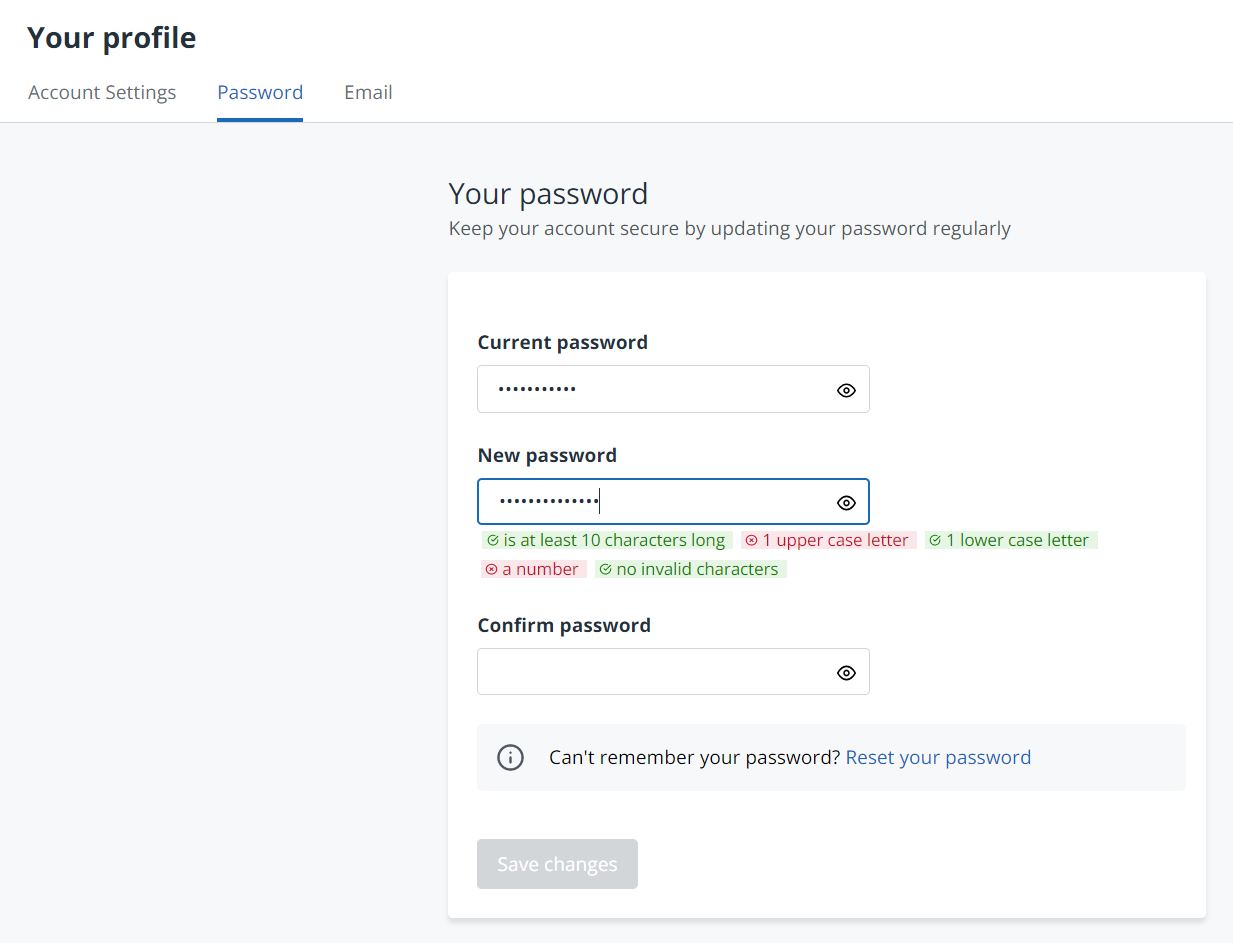 - In the New password and Confirm password boxes, enter your new password. Any errors highlighted in red must be corrected before the new password can be saved.