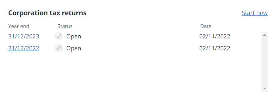 The Corporation tax returns widget on the client dashboard shows any existing returns and provides access to start a new one by selecting Start new (if there are no returns listed, select Start a new tax return).