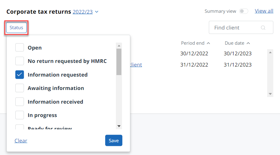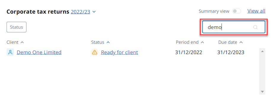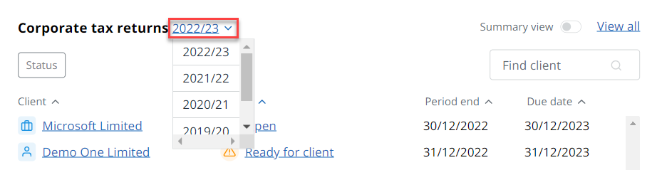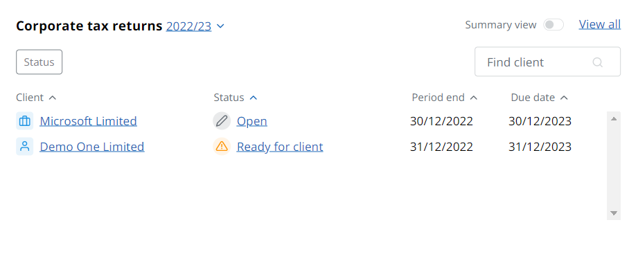 The Corporate tax returns widget on the home dashboard shows a list of corporate client tax returns including the client name, status, period end and due date. Select View all to view a list of all available tax returns.