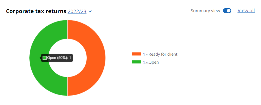 Hover over each section to see the number of clients within each type. Select an item in the legend to view a list of tax returns with that status. You can then view a return from within that list, or download a list of those returns as PDF or CSV files.
