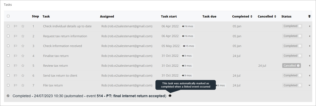 When a smart task has auto-completed, it is marked as being "completed when a linked even occurred".