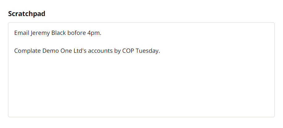 We've added a new Scratchpad widget to the home page dashboard. This widget is a great way to quickly add notes on your Home page dashboard. These notes are only visible to you and can be used as reminders, to do lists, notes from a call, or anything else you want to record.