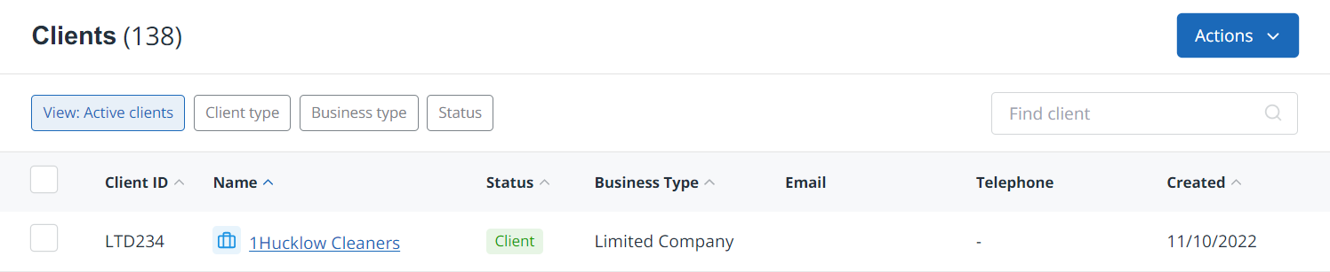 We've added some new filters to the client list to limit the number of client records shown. You can now filter by active / inactive clients, client type, business type or status.