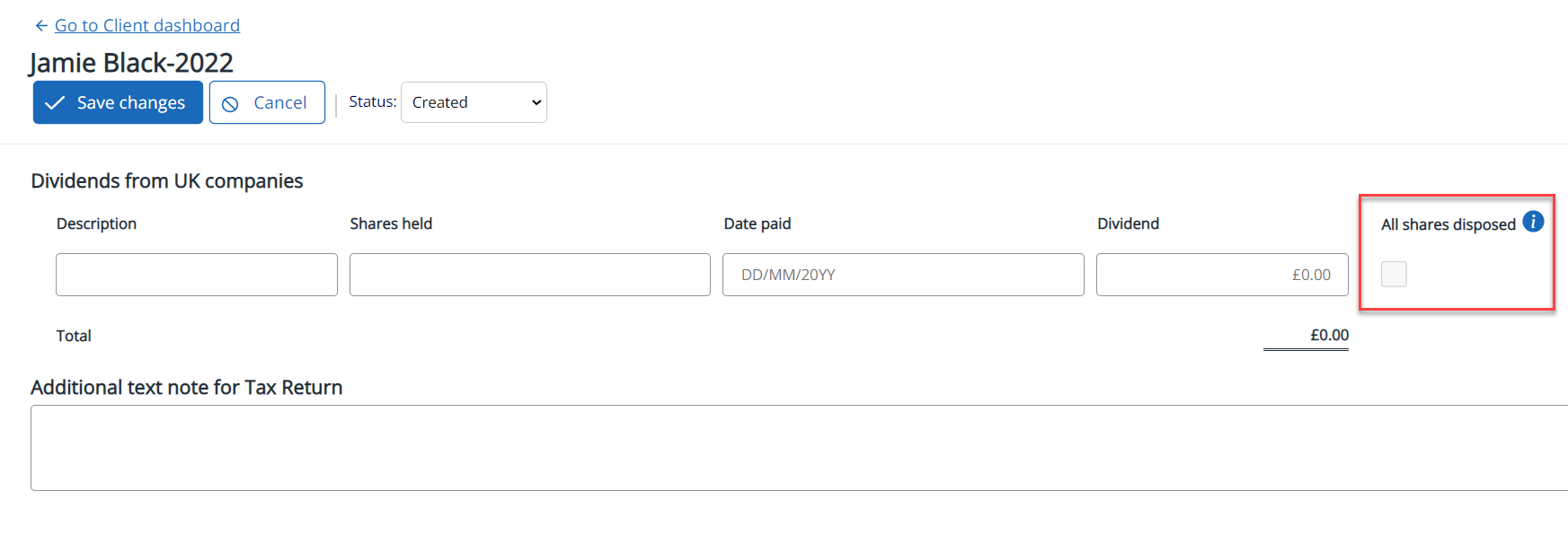 When producing personal tax returns, it is now possible to identify dividends (stock dividends, other dividends and dividends from UK companies) that have been sold. By selecting the All shares disposed check box, the dividends are not carried through into the following year.
