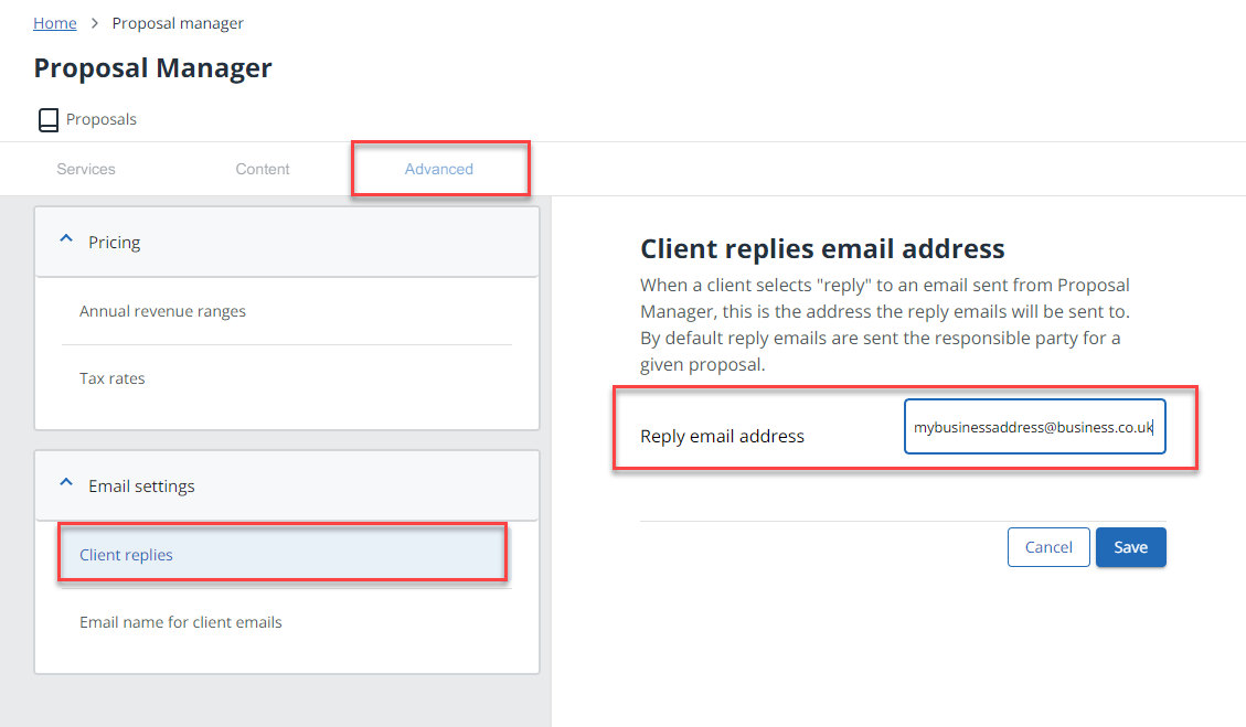IRIS Elements Proposal Manager sends emails relating to proposals on your behalf. By default, any client replies are automatically sent to the person responsible for the proposal. If a client chooses to reply to one of these emails, you can specify the reply email address to use. You can also choose a name for the email account, such as your practice name.