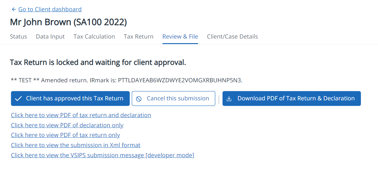 1. Once you have obtained client approval, select Client has approved this tax return. Additional options are available to view PDFs.