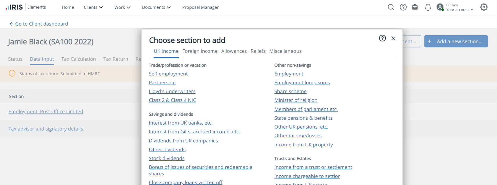 On Choose a section to add, select the required section (any previously added sections are crossed through). Once added, the section can be edited by selecting its name. Find out more about the available sections.