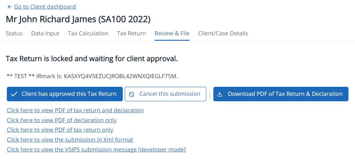 The tax return is locked and you can view various PDF files and Download PDF of Tax Return and Declaration to send to your client.