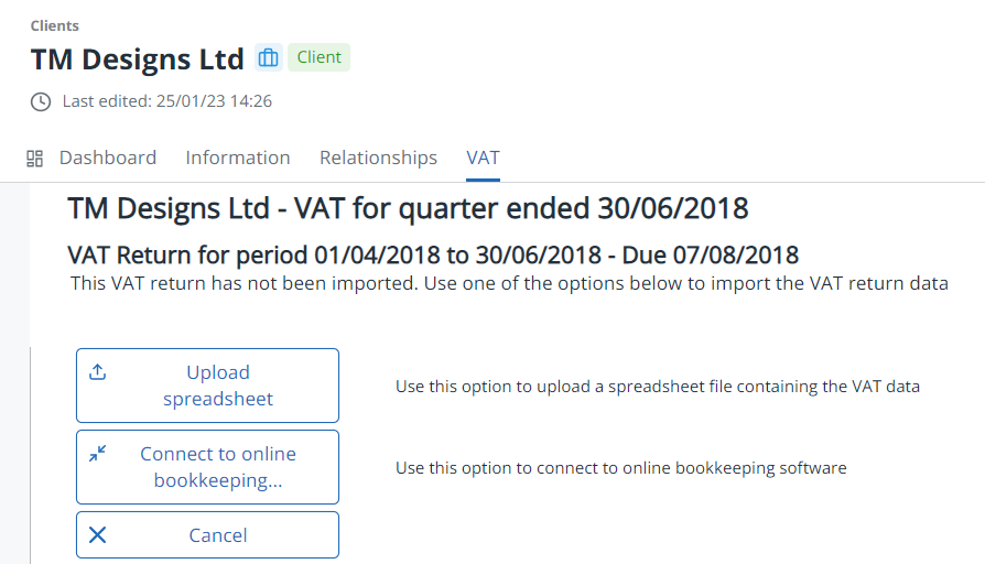 Before starting VAT work on a client record, make sure that the VAT registration number has been recorded on the Information tab. Refer to Record client information (tax).