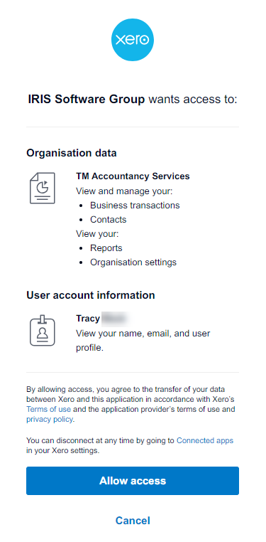 If you're experiencing problems when connecting to Xero, you can try disconnecting IRIS Elements from your Xero account, then try again. This can be done in the Settings > Connected Apps area of Xero.