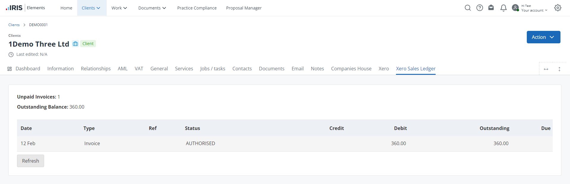 If you've connected your practice's Xero account to IRIS Elements and imported your Xero customers, you can view sales ledger information on their client record including invoices raised, invoices paid, outstanding balance, etc. This information is displayed on the Xero sales ledger tab on the client record.