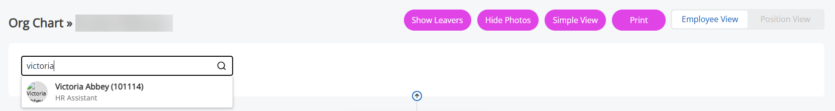 The chart defaults to display current employees and allows you to view and filter information about your team and organisation using the Employee View and Position View options:
