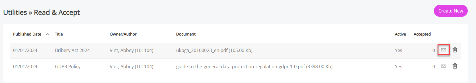 All previously created Read & Accept documents, including those created via Company Handbook display.
