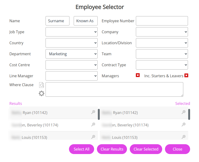 If needed, use the Employee Selector to invite only specific employees who match a specific criteria.