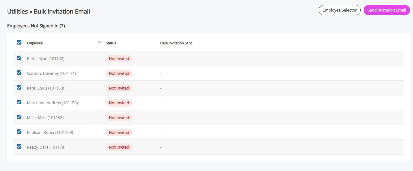 The Employees Not Signed In table also updates to show an Invitation Sent status for the employees you have invited