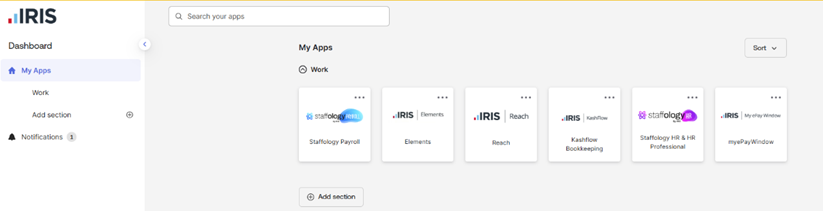 Access other IRIS apps (e.g., Reach, Elements, Staffology Payroll) using the same credentials.