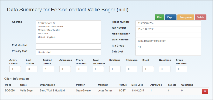 Clicking the View Contact button to view the Contact Data Summary page.